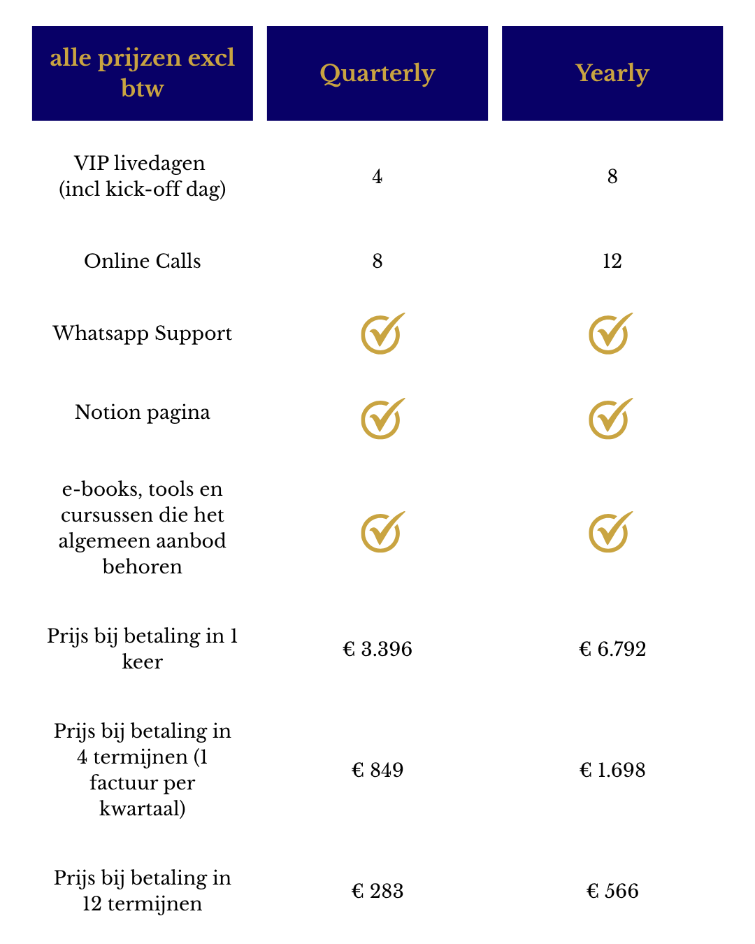 Elk kwartaal een livedag of 8 livedagen per jaar – op deze manier loop je nooit achter de feiten aan en heb je steeds jouw persoonlijke business partner die naast jou staat om jouw business mee te blijven structureren, om jouw focus te behouden, om jou rust, flexibiliteit te bieden. Zodat jij de luxe kan ervaren van een leven in vrijheid, volgens jouw voorwaarden.